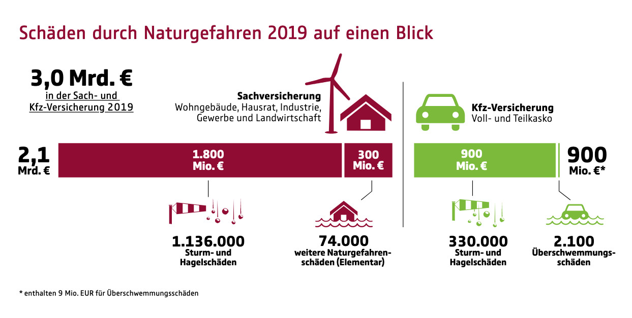 Vom Gesamtschaden waren demnach 2,7 Milliarden Euro auf Sturm und Hagel an Gebäuden, Kraftfahrzeugen, Hausrat, Gewerbe, Industrie und Landwirtschaft zurückzuführen. Weitere 300 Millionen Euro entfielen auf Elementargefahren wie Hochwasser, Starkregen oder Erdrutsch (siehe GDV-Grafik).