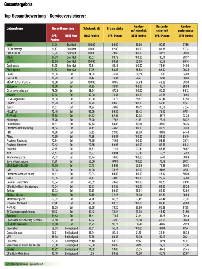 Demnach erzielen WWK und Ergo mit jeweils über 90 DFSI-Punkten die Note „Exzellent“. Auf den letzten drei Rängen der 52 untersuchten Serviceversicherer finden sich die Versicherer im Raum der Kirchen, die Debeka und die Öffentliche Oldenburg (siehe Grafik).
