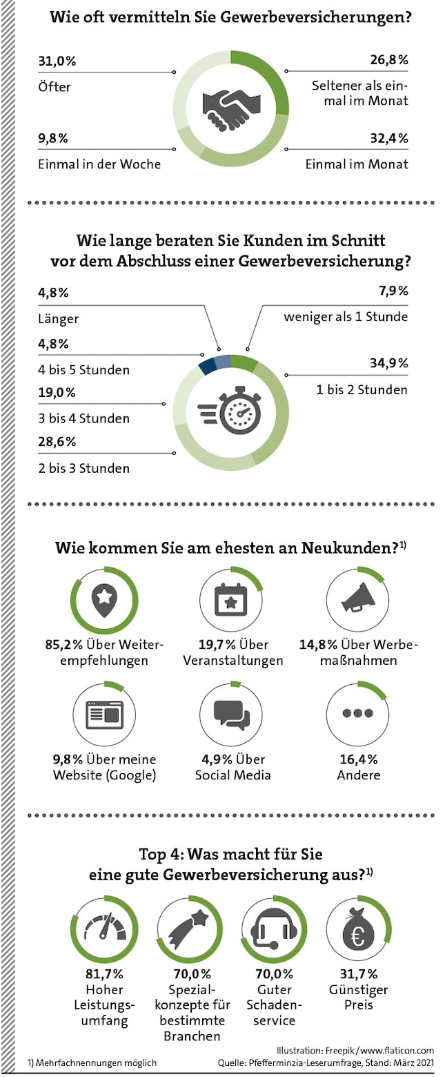 Bei unserer Umfrage ging es aber nicht nur um die Auswirkungen der Corona-Pandemie. Wir wollten auch ganz generell wissen, wie unsere Leser zum Thema Gewerbeversicherung beraten. Die relative Mehrheit (32,4 Prozent) vermittelt diese Produkte dabei einmal im Monat. 31 Prozent kommen auf Abschlüsse mehrmals die Woche. Eine Beratung dauert dabei meist ein bis zwei Stunden, geben 35 Prozent der Befragten an. Bei knapp 30 Prozent sind es zwei bis drei Stunden.