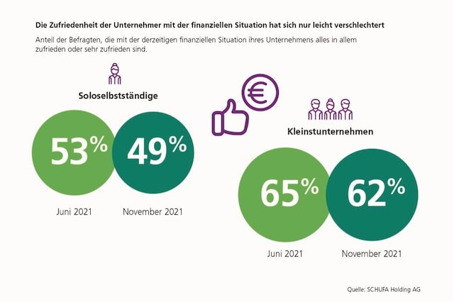 Trotz der vierten Corona-Welle bewerten die Soloselbstständigen und Kleinstunternehmen hierzulande die Lage ihres Unternehmens weiter überwiegend positiv. 49 Prozent der Soloselbstständigen und 62 Prozent der Kleinstunternehmen äußern sich zufrieden oder sehr zufrieden mit ihrer finanziellen Situation.