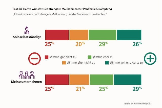 Weniger positiv ist die Stimmung, wenn es um die Corona-Politik der Regierung geht. Nur noch 44 Prozent der Befragten beider Gruppen halten die staatlichen Corona-Maßnahmen für angemessen. Im Sommer lagen die Zustimmungswerte noch bei 59 (Soloselbstständige) beziehungsweise 66 Prozent (Kleinstunternehmen). Der Aussage „Ich wünsche mir noch strengere Maßnahmen, um die Pandemie zu bekämpfen“ stimmen 55 Prozent der Soloselbstständigen und 54 Prozent der Kleinstunternehmen zu.