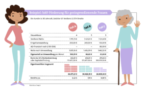Diese große Gruppe benötigt sachkundige Beratung, denn auch für sie bestehen geeignete Fördermöglichkeiten in der betrieblichen Altersvorsorge. Ihren Anspruch auf Entgeltumwandlung in der bAV nehmen Frauen jedoch oft aufgrund ihres geringen Einkommens gar nicht wahr. Der Gesetzgeber hat über den Paragrafen 100 Einkommensteuergesetz (EStG) eine Möglichkeit zusätzlicher arbeitgeberfinanzierter Modelle geschaffen – gewissermaßen eine Betriebsrente für Geringverdienende.