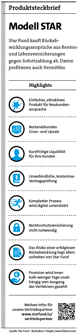 Um diese attraktive Variante der Rückabwicklung Verbrauchern nahezubringen, arbeitet Star Fund mit einem stetig wachsenden Netzwerk an deutschen Vertriebspartnern zusammen. Neben Versicherungsmaklern und Finanzberatern eignet sich das Geschäftsmodell auch für Vermögensverwalter und Family Offices, da der Rückkaufswert lange gebundenes Kapital frei macht, das dann von den Asset Managern über attraktivere Angebote direkt am Kapitalmarkt professionell und gewinnbringender angelegt werden kann. Vorteil: Es gibt keine Stornohaftung für Vertriebspartner.