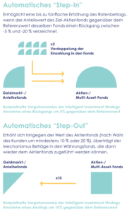 Wenn Aktienkurse fallen, löst das System Kaufsignale aus (Step-in), während es bei gestiegenen Werten automatisch verkauft, um Gewinne mitzunehmen (Step-Out). Diese werden dann in sicheren geldmarktnahen Fonds gelagert, bis sich weitere günstige Kaufoptionen ergeben. Das alles findet automatisiert und ohne Kundenkontakt oder Berateraufwand statt, während der Versicherer die Haftung übernimmt. Die Anleger entscheiden dabei selbst, welche Fonds ins Portfolio kommen und wie die Rahmenbedingungen zum Umgang mit Ihrem Kapital aussehen, etwa wie hoch die Gewinne sein müssen, bevor Werte wieder verkauft werden.