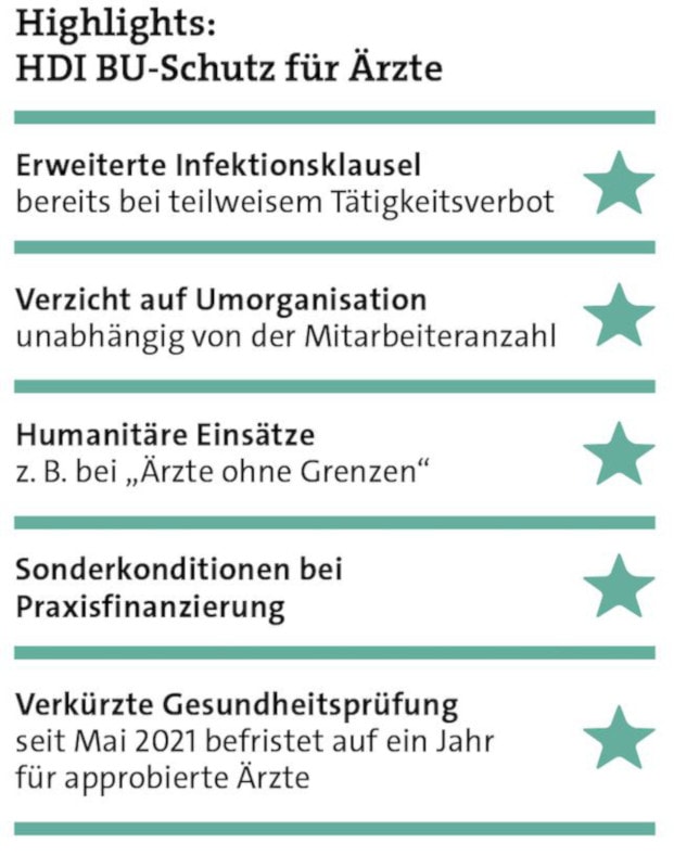 Das zeigt: Für den Fall der Fälle ist die Kammerversorgung als Berufsunfähigkeitsschutz allein nicht ausreichend und sollte um einen privaten Einkommensschutz ergänzt werden. Und genau dafür hat HDI die passende Lösung – eine BU-Versicherung mit einem optimalen Preis-Leistungs-Mix, die durch spezielle Features auf die besonderen Bedürfnisse von Ärzten zugeschnitten ist. Dazu zählen etwa eine erweiterte Infektionsklausel, die bereits bei teilweisem Tätigkeitsverbot greift, sowie ein Verzicht auf Umorganisa­tion unabhängig von der Mitarbeiteranzahl. Seit Anfang Mai gilt außerdem eine verkürzte Gesundheitsprüfung – vorerst befristet auf ein Jahr.