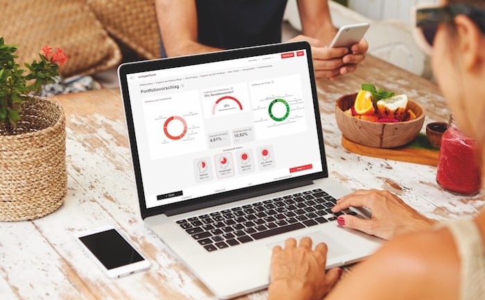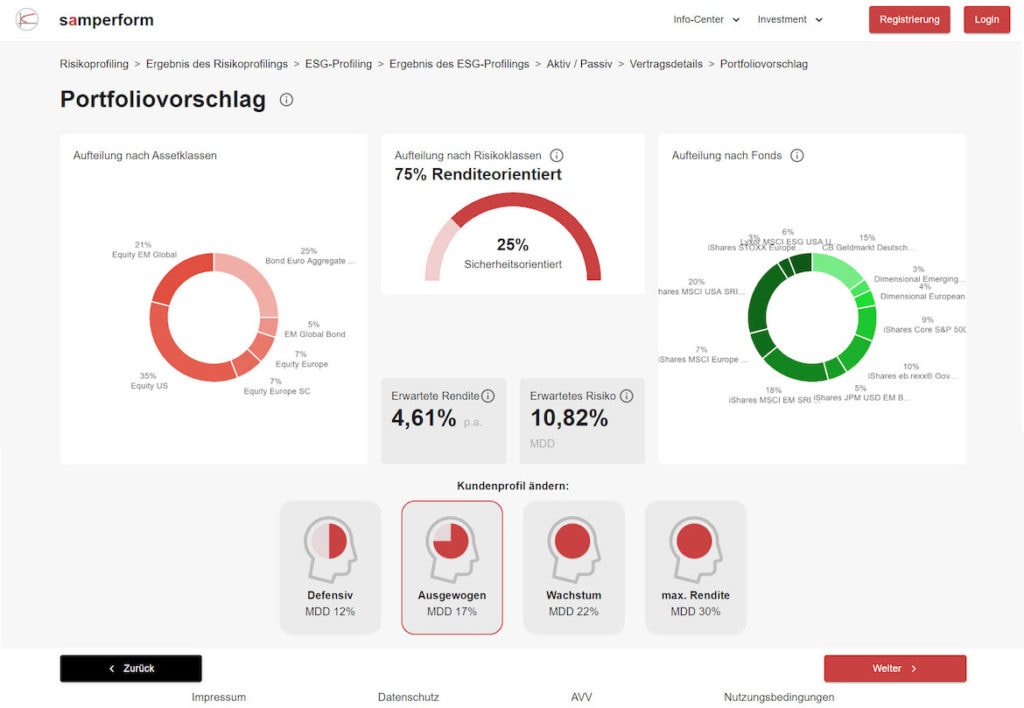 Dieses Profil bildet die Basis für den konkreten Portfoliovorschlag. Des Weiteren kann festgelegt werden, ob sich das Portfolio ausschließlich auf Basis von ETFs zusammensetzen soll, oder durchaus aus einer optimierten Mischung von ETFs und aktiv gemanagten Fonds. Somit ist der Portfoliovorschlag individuell auf die jeweilige Kundin oder den jeweiligen Kunden zugeschnitten.