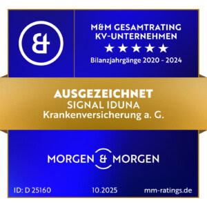 Seit fast 120 Jahren agiert die SIGNAL IDUNA Krankenversicherung a. G. als Versicherungsverein auf Gegenseitigkeit und ist damit ausschließlich ihren Mitgliedern verpflichtet. Die finanzielle Solidität und nachhaltige Geschäftspolitik wird seit Jahren von unabhängigen Ratingagenturen bestätigt. So bewertet unter anderem Morgen & Morgen den Krankenversicherer im wichtigen Teilaspekt Sicherheit mit der Bestnote „ausgezeichnet“.