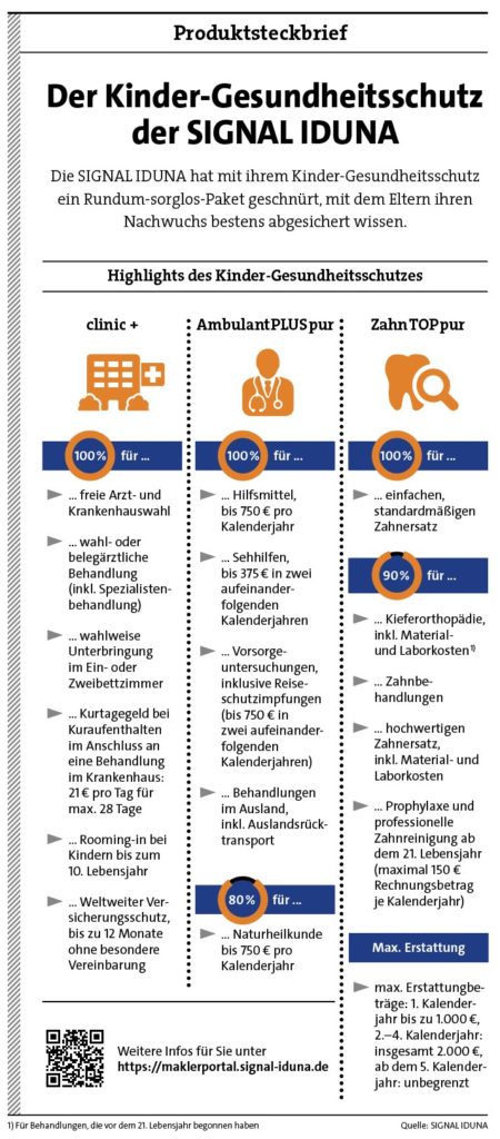 Mit dem Kinder-Gesundheitsschutz von SIGNAL IDUNA (mit vereinfachtem Beantragungsverfahren) ist das möglich. Zu einem Preis von nur 24,88 Euro im Monat ist die ambulante, stationäre, zahnärztliche und kieferorthopädische Versorgung gesichert. Der Tarif clinic + etwa bietet eine freie Krankenhauswahl und die bestmögliche Behandlung durch Spezialisten. Die Rooming-in-Leistung komplettiert die stationäre Absicherung. Im Tarif ZahnTOPpur sind unter anderem 90 Prozent Erstattung für Kieferorthopädie, Zahnbehandlung und hochwertigen Zahnersatz versichert. AmbulantPLUSpur bietet etwa 100 Prozent für erweiterte Kinder- und Jugend-Vorsorgeuntersuchungen (bis 750 Euro in zwei aufeinanderfolgenden Kalenderjahren).