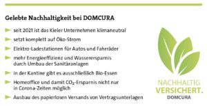 Doch nachhaltiges Handeln geht weit über die Produkte hinaus. Der Wohngebäudeversicherungs-Spezialist DOMCURA hat deshalb frühzeitig gehandelt. Und präsentierte als erster Anbieter in Deutschland eine nachhaltige Police für Einfamilienhaus-Besitzer. So erhalten Kunden im Schadenfall eine Mehrleistung für nachhaltigen Schadenersatz in Höhe von bis zu 50.000 Euro. Ganz gleich, ob es dabei um den zerstörten Kunststoff-Fußboden geht, der durch Holz ersetzt wird, oder um energieeffiziente Dämm-Materialien oder besonders stromsparende Geräte. Und bei einem Feuerschaden garantiert diese grüne Police die komplette Kompensation des klimaschädlichen Treibhausgases CO₂ in Form von Aufforstung von Wäldern.