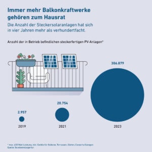 Beispiel Photovoltaik: Das Solarpaket 1 der Bundesregierung, sieht weitreichende Vereinfachungen für Balkonkraftwerke vor. So soll die Verpflichtung zur Anmeldung beim Netzbetreiber entfallen. Auch dürfen künftig 800 statt wie bisher nur 600 Watt ins Stromnetz eingespeist werden. Balkonkraftwerke werden damit noch attraktiver.