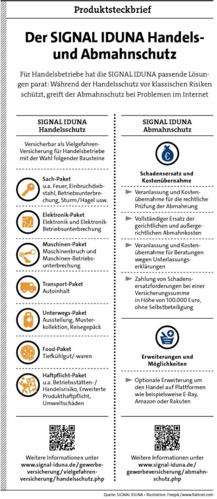 So kann ein Abmahnschutz den bestehenden Handelsschutz der SIGNAL IDUNA sinnvoll ergänzen. Bei der Vielgefahren-Police können 140 Betriebsarten im Einzelhandel mit einem Jahresumsatz bis zu 5 Millionen Euro versichert werden. Dabei beträgt die Regeldeckungssumme pauschal ebenfalls maximal 5 Millionen Euro und richtet sich nach dem Jahresnettoumsatz. Sie kann aber alternativ auch mit 10 und 15 Millionen Euro gewählt werden.