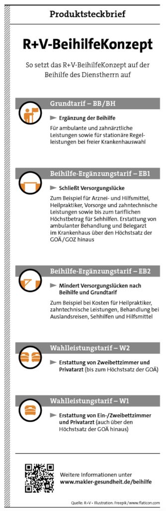 Zudem erstattet R+V in der comfort-Variante Zweibettzimmer und Privatarzt bei freier Krankenhauswahl, während in der premium-Variante bei freier Klinikwahl die Kosten für Einbettzimmer und Privatarzt auch über die Höchstsätze der gültigen Gebührenordnung hinaus übernommen werden. Im Beihilfe-Ergänzungstarif finden sich zum Beispiel die Erstattung der Restkosten für Heilpraktiker, Sehhilfen, zahntechnische Leistungen und eine notwendige Behandlung bei einer Reise ins Ausland wieder. In dessen premium-Variante ist unter anderem eine Geburtspauschale für Frauen enthalten.
