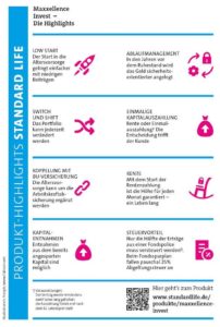 Nicht neu bei „Maxxellence Invest“, aber vor allem für Berufseinsteiger ein wichtiger Baustein, ist die Berufsunfähigkeitsversicherung. „Die Absicherung der Arbeitskraft gehört neben den Haftpflichtversicherungen zur wichtigsten Vorsorge überhaupt. Gerade die Kombination aus Sparen fürs Alter und Absichern der Berufsunfähigkeit ergibt für junge Kunden viel Sinn. ‚Maxxellence Invest‘ bietet hier attraktive Möglichkeiten“, sagt Steffen Liebig, BU-Experte bei Standard Life. „Die bedarfs- und altersgerechte Entnahme der Risikokosten sorgt dafür, dass bei jungen Kunden mehr Kapital direkt investiert werden kann. Dies optimiert den Aufbau der Altersvorsorge. Ein weiteres Highlight ist die Beitragsbefreiung im BU-Fall. Hier übernehmen wir die Beitragszahlung, der Sparprozess wird also nicht unterbrochen. Die Beitragsbefreiung kann unabhängig von Einkommen und Beruf mit einer vereinfachten Gesundheitserklärung beantragt werden.“