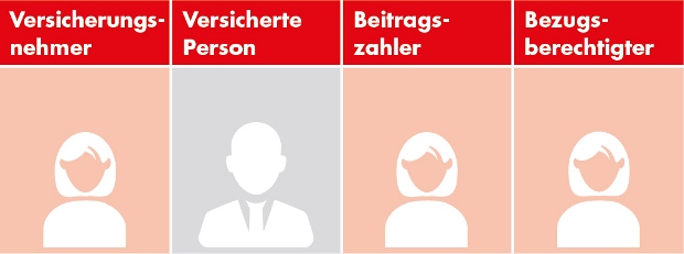 Versicherungsnehmerin ist beispielsweise die 20-jährige Tochter. Die versicherte Person ist der 45-jährige Vater. Beitragszahlerin und Bezugsberechtigte ist ebenfalls die Tochter. Verstirbt der Vater beispielsweise mit 90 Jahren, ist die Tochter 65 und erhält das Guthaben als Todesfall-Leistung.