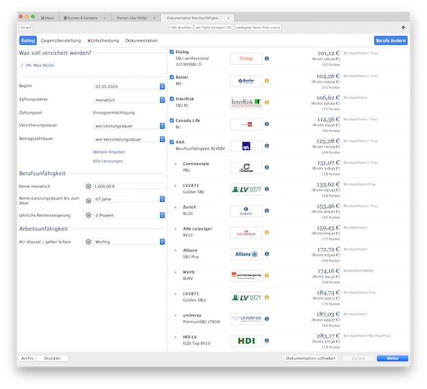 Um das herauszufinden, haben die Inveda-Experten zunächst zwei Vergleichspersonen herangezogen, welche die gleichen Grundanforderungen an eine Berufsunfähigkeitsversicherung stellen. Heißt im Klartext: Die Police soll bei beiden eine BU-Rente von 1.600 Euro, eine AU-(Arbeitsunfähigkeits)-Klausel, eine jährliche Rentensteigerung von mindestens 2 Prozent sowie eine Versicherungsdauer bis zum Alter von 67 Jahren enthalten.