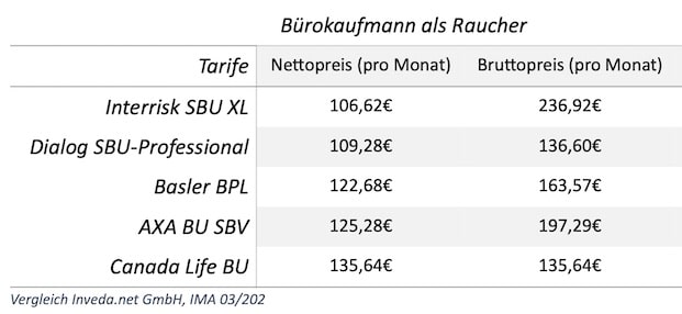 Für den Vergleich wurden 36 BU-Tarife von 17 Versicherungsgesellschaften herangezogen, welche Kostenunterschiede zwischen Rauchern und Nichtrauchern aufweisen. So dann habe man jeweils die fünf günstigsten Versicherungen ausgewählt, welche für beide Vergleichspersonen verfügbar seien, erklären die Analysten.