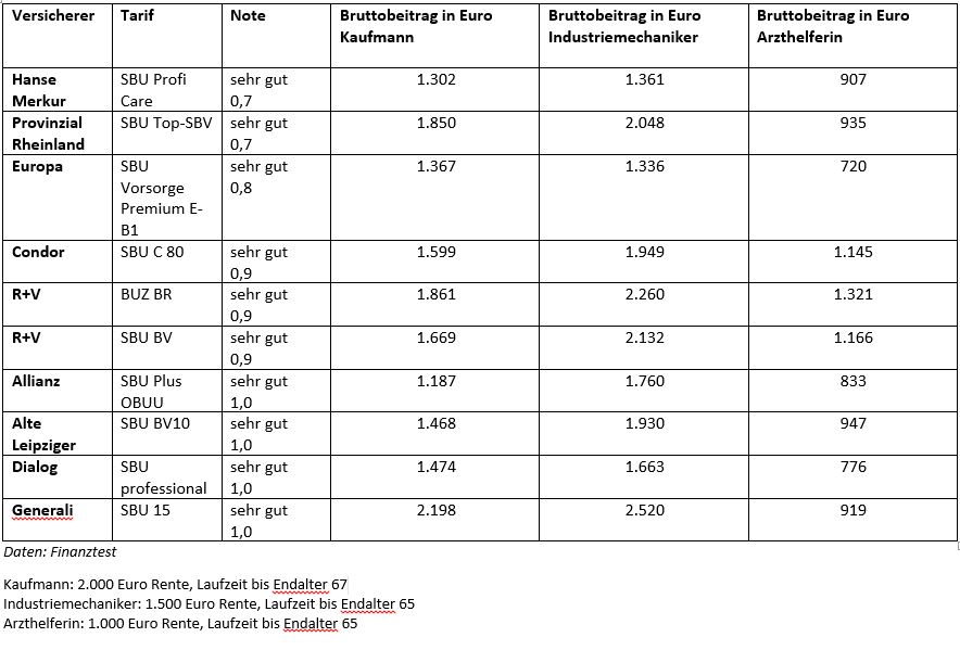 Das ist die Top-10 der BU-Tarife mit den Brutto-Jahres-Beiträgen der Musterkunden: