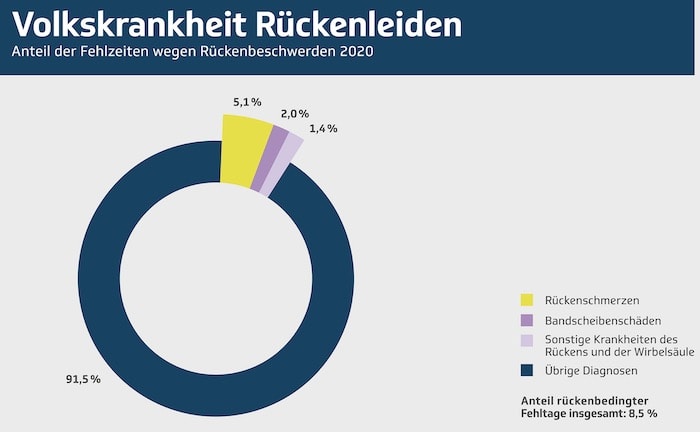 Rückenleiden waren 2020 für 8,5 Prozent der Fehltage hierzulande verantwortlich.