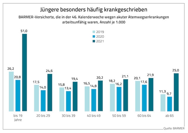 Immer mehr junge Berufstätige werden aufgrund akuter Atemwegserkrankungen krankgeschrieben. Das geht aus einer Analyse aus Daten der Krankenkasse Barmer hervor. Demnach waren vom 14. November bis 20. November rund 51 von 1.000 unter 20-Jährigen aufgrund einer Atemwegserkrankung arbeitsunfähig. Das sind doppelt so viele wie bei den 20- bis 29-Jährigen mit rund 25 von 1.000 Beschäftigten. Auch alle älteren Arbeitnehmerinnen und Arbeitnehmer waren deutlich seltener aufgrund dieser Diagnose krankgeschrieben.