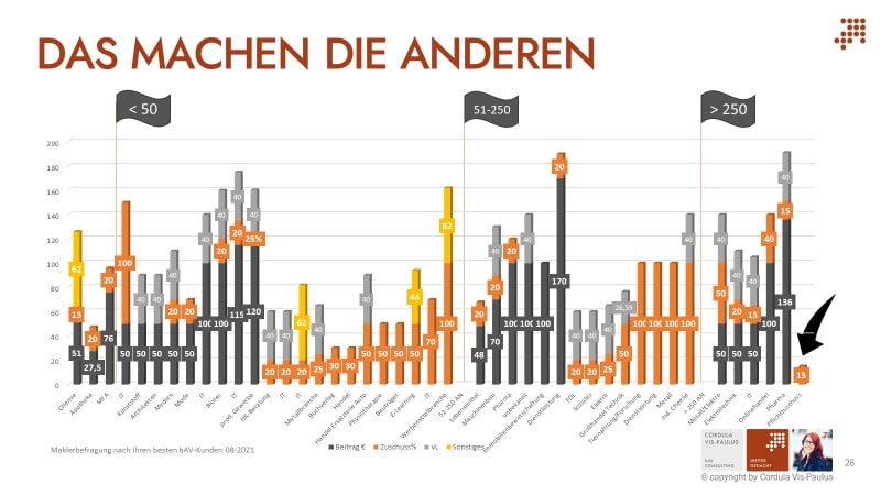 Diese seien „für Makler, nicht tarifgebundene KMU und die Versicherer Gold wert“, schreibt Vis-Paulus. „Warum? Weil sie für alle Beteiligten positive Auswirkungen haben“, so die bAV-Fachfrau. 40 Unternehmen und 36 Makler haben an der Umfrage teilgenommen. Laut Vis-Paulus liegt die erreichte Zahl über alle Betriebe hinweg bei bis zu 4.000 Mitarbeitern.
