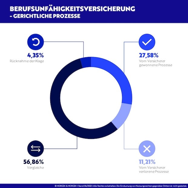 Beim Blick auf die gerichtlichen Prozessquote zeige sich wiederum, dass Prozesse „größtenteils zu einem Vergleich führen“, wie es bei Morgen & Morgen heißt (siehe vierte Grafik). „Der hohe Anteil an Prozessen, die vom Versicherer gewonnen werden, zeigt, dass die Ablehnung der Leistung berechtigt war und der Versicherer im Sinne des Kollektivs gehandelt hat“, resümiert Analyst Ludwig.