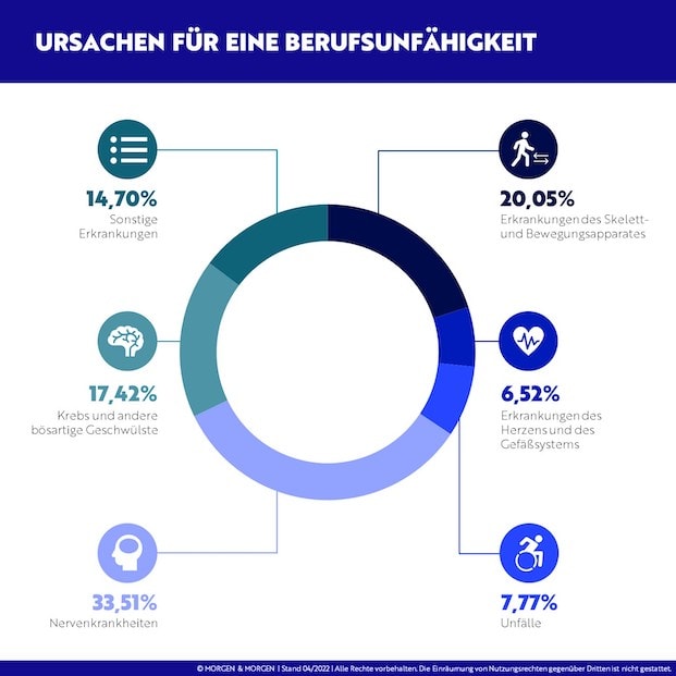 Wenn die Seele streikt, ist das nach wie vor der Hauptauslöser für eine BU-Rente: Exakt 33,5 Prozent der Leistungsfälle in der Berufsunfähigkeitsversicherung (BU) gehen laut einer aktuellen Auswertung des Analysehauses Morgen & Morgen (M&M) auf Nervenerkrankungen zurück, worunter auch psychische Leiden fallen (siehe erste Grafik).