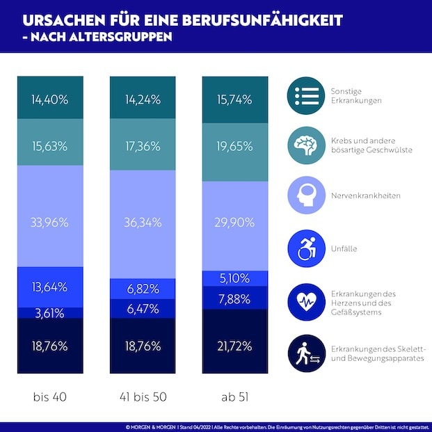 Zum Vergleich: 2008 betrug der Anteil noch weniger als ein Viertel – und bei Morgen & Morgen geht man von einer weiteren Zunahme aus: „Dieser Trend wird sich sicherlich fortsetzen. Noch sind die psychischen Auswirkungen der Corona-Pandemie nicht in den Statistiken gelandet“, sagt Andreas Ludwig, Bereichsleiter Rating & Analyse. Und auch die Aufschlüsselung nach Altersstufen zeigt, dass sich die Nervenerkrankungen als Hauptursache für eine BU in allen Altersgruppen durchzieht (siehe zweite Grafik).