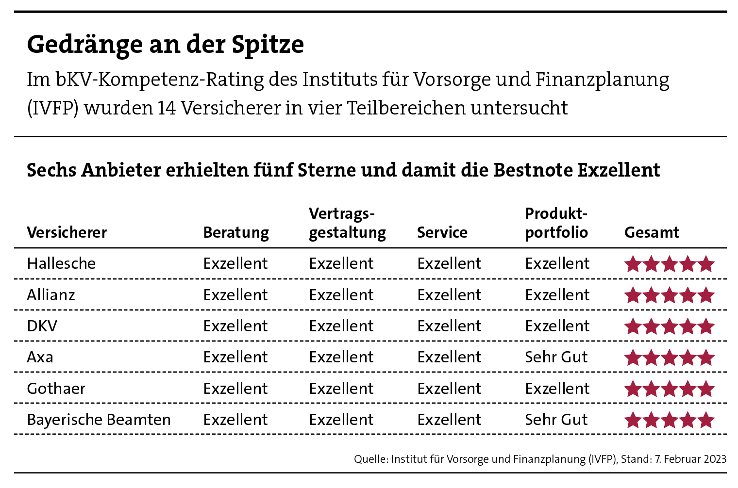 Um im Wettbewerb zu bestehen, bieten sich den Versicherern unzählige Stellschrauben. Ein echter Kenner der verästelten Produktlandschaft ist Malte Kamph, Abteilungsleiter KV beim Hamburger Analysehaus Ascore Das Scoring. Sein Haus nahm im vergangenen Jahr erstmals eine marktweite Bewertung der bKV-Budget­tarife vor. Er bescheinigt dem Segment einen regelrechten Qualitätsschub: Denn fast alle Tarife, die in der zweiten Jahreshälfte 2022 auf den Markt strömten, hat Ascore mit fünf oder sechs Kompassen bewertet. Wobei sechs Kompasse die Höchstbewertung darstellt. Von den älteren Tarifen mussten sich hingegen noch 60 Prozent der Budgettarife mit einer Bewertung von vier Kompassen begnügen.