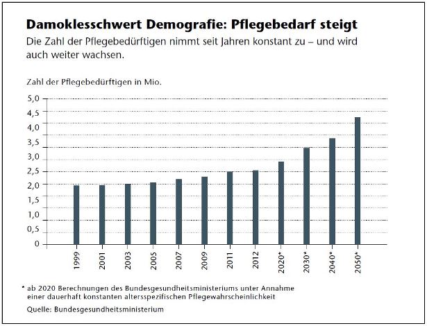 Die Pflegerente ist so ausgestaltet, dass eine von der Pflegestufe abhängige monatliche Rente ausgezahlt wird. Ähnlich wie beim Thema BU wird das Thema „Pflegefall“ vielfach unterschätzt. Dabei reichen die Leistungen der gesetzlichen Pflegeversicherung oftmals nicht aus, um die mit der Pflege verbundenen Kosten zu decken. Hinzu kommt, dass die Zahl der Pflegebedürftigen in den kommenden Jahrzehnten kontinuierlich zunimmt: Waren es 2011 noch 2,5 Millionen Deutsche, werden es im Jahr 2050 nach Berechnungen des Bundesgesundheitsministeriums voraussichtlich mehr als 4 Millionen sein.