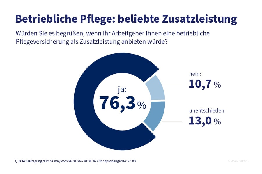 Um die Kosten für die Pflege in den Griff zu bekommen, wünschen sich die meisten Bürger Unterstützung von ihrem Chef: 76,3 Prozent der Beschäftigten in Deutschland würden es begrüßen, wenn ihr Arbeitgeber eine betriebliche Pflegeversicherung (bPV) zur Absicherung von Eigenanteilen im Pflegefall anbieten würde.