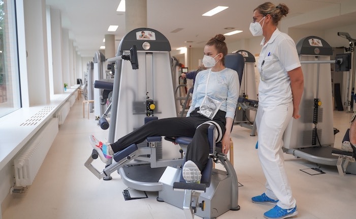Eine Long-Covid-Patientin bei der medizinischen Trainingstherapie mit einer Sporttherapeutin im Unfallkrankenhaus Berlin.
