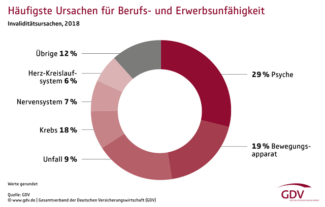 Weiter zeigt die Statistik, dass psychische Erkrankungen auch weiterhin der häufigste Grund für eine Berufsunfähigkeit sind – ihr Anteil beträgt 29 Prozent. In 19 Prozent der Fälle sind Erkrankungen des Bewegungsapparats, insbesondere Rückenleiden, für die Berufsunfähigkeit verantwortlich.