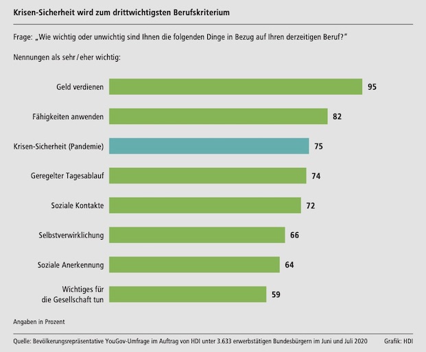 Durch die Erfahrungen während der Corona-Pandemie haben die Deutschen ihre Einstellung zum Beruf verändert, so die Schlussfolgerung aus einer Befragung im Rahmen der aktuellen HDI-Berufe-Studie 2020. „Sicherheit in Krisenfällen, wie etwa durch Corona“, wird demzufolge zum Top-Kriterium im Beruf. Drei Viertel der rund 3.600 befragten Erwerbstätigen schätzen das als wichtig ein. Die Umfrage hat das Marktforschungsunternehmen Yougov im Juni und Juli im Auftrag des Versicherers HDI durchgeführt.