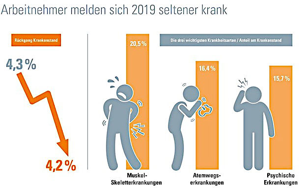 Der Krankenstand von Arbeitnehmern in Deutschland ist im ersten Halbjahr 2019 im Vergleich zum Vorjahr leicht gesunken. Das zeigen aktuelle Zahlen der Krankenkasse DAK-Gesundheit. Zu Fehltagen kommt es danach bei den Männern am häufigsten wegen Rückenschmerzen, bei Frauen wegen psychischer Erkrankungen.
