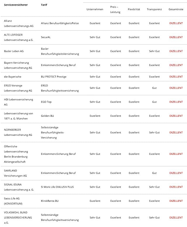 Serviceversicherer, die die Bestnote „Exzellent“ erhielten