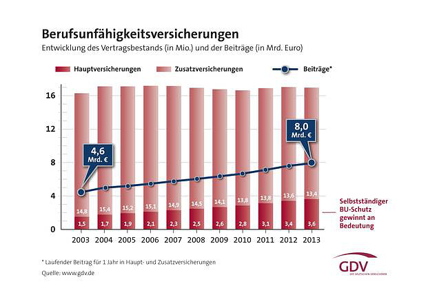 In den vergangenen zehn Jahren hat sich der Vertragsbestand von Berufsunfähigkeitspolicen mehr als verdoppelt. So gab es 2003 einen Bestand von zirka 1,5 Millionen BU-Verträgen. 2013 lag die Zahl bei 3,6 Millionen BU-Hauptpolicen.