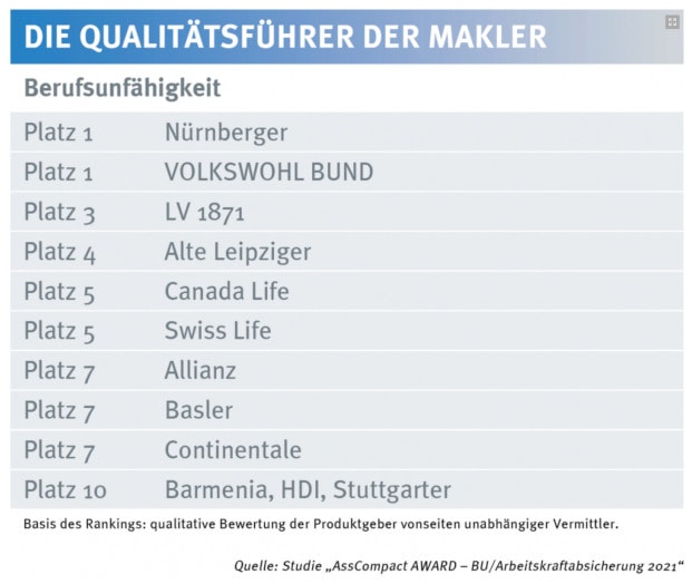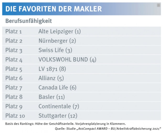 Um unabhängigen Vermittlern bei der Suche nach den besten Produktgebern für Berufsunfähigkeitsversicherungen (BU) Orientierung zu bieten, hat das Fachmagazin Asscompact untersucht, an welche Gesellschaften Versicherungsmakler und Mehrfachagenten das meiste Geschäft vermitteln und mit welchen Anbietern sie am zufriedensten sind. Für die Studie „Asscompact Award – BU/Arbeitskraftabsicherung 2021“ wurden 568 Vermittler aus der Finanz- und Versicherungsbranche befragt. Große Verschiebungen bei den vorderen Platzierungen gab es im Vergleich zum Vorjahr nicht.