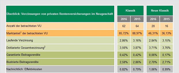 Die Zinsen gesenkt haben die Versicherer aber auch bei diesen Produkten. Für 2016 liegt die laufende Verzinsung der hier betrachteten Tarife im arithmetischen Mittel bei 2,84 Prozent (Vorjahr: 3,15 Prozent). Vergleicht man die laufende Deklaration unternehmensindividuell mit der jeweiligen klassischen Police der betrachteten Anbieter, so liegt die Überschussbeteiligung der Neuen Klassik im Durchschnitt höher als in der Klassik, wo die jeweiligen Produkte einen laufenden Zins von 2,77 Prozent erhalten.