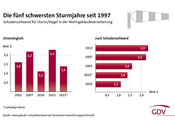 Fakt ist jedoch, dass Stürme heftiger werden und häufiger vorkommen. Klimaforscher vermuten, dass besonders intensive Stürme, wie sie derzeit nur alle 50 Jahre vorkommen, bis zum Jahr 2100 alle 10 Jahre auftreten werden. Eine Herausforderung für die Anbieter von Wohngebäudeversicherungen, die ihre Risiken immer genauer kalkulieren müssten.