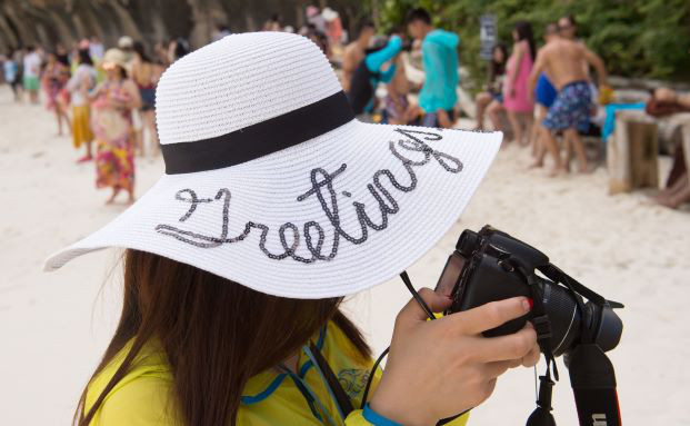 Touristen tummeln sich am Strand von Maya Bay auf Ko Phi Phi Leh, Thailand.