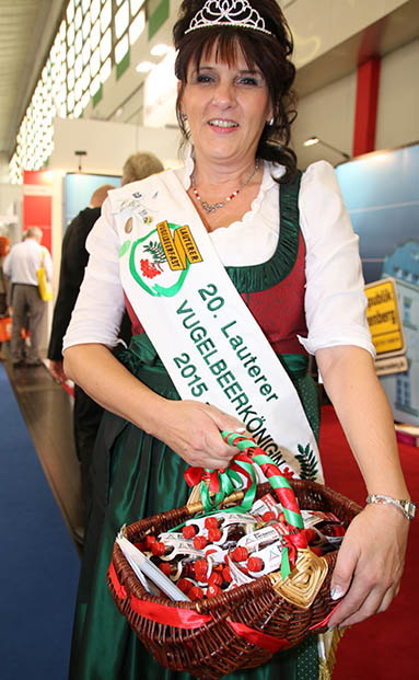 Größere Mengen an Wildfrucht-Kräuter-Likör aus dem Erzgebirge brachte die „Lauterberger Vugelbeerkönigin“ im Auftrag von Der Sachpool charmant unter die Messebesucher