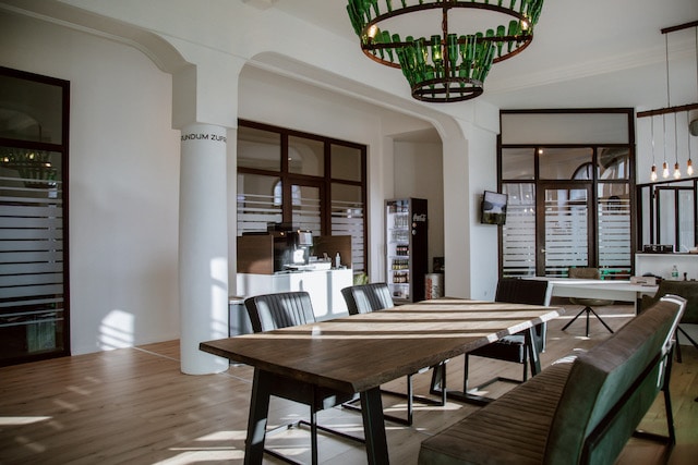 „Wir haben eine alte Kneipe komplett saniert und in ein Versicherungsbüro verwandelt. Einen Kronleuchter samt Bierflaschen konnten wir retten und er erinnert an die Vergangenheit unseres Büros.
