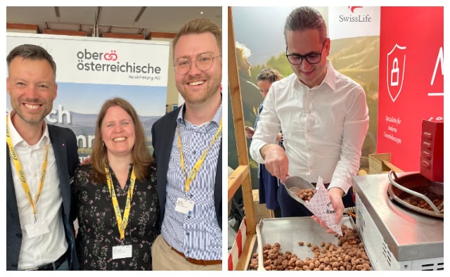 Linkes Bild: Paul Ristock, Chef der deutschen Niederlassung des Oberösterreichischen Versicherung mit Karen Schmidt und Alexander Grund von Pfefferminzia. Auf dem Stand der Swiss Life gab es leckere gebrannte Mandeln (rechtes Bild).