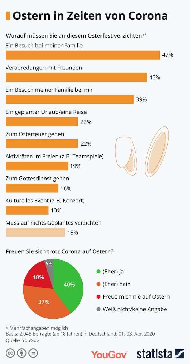 Das bevorstehende Osterfest wird von der Corona-Krise überschattet – und doch freuen sich immerhin 40 Deutschen auf die Feiertage, wie eine aktuelle Umfrage des Marktforschers Yougov zeigt. Demnach will die Hälfte der Befragten (47 Prozent) auf einen geplanten Besuch bei der Familie verzichten. Weitere Details zeigt unsere Grafik der Woche.