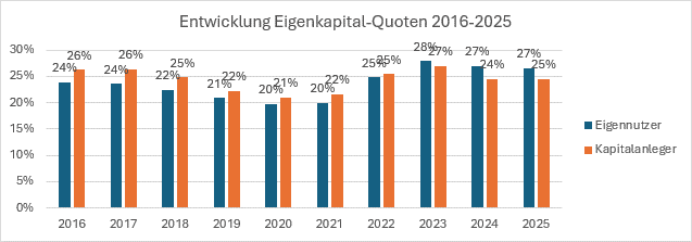 Parallel zur veränderten Zins- und Preisentwicklung hat sich auch die Finanzierungskultur gewandelt. Seit der Zinswende bringen Käuferinnen und Käufer im Durchschnitt deutlich mehr Eigenkapital ein. Die Eigenkapitalquote von Eigennutzern stieg von rund 20 Prozent in den Jahren 2020 und 2021 auf etwa 27 Prozent im Jahr 2025. Gleichzeitig sank der Beleihungsauslauf von knapp 89 Prozent im Jahr 2020 auf nun rund 84 Prozent.