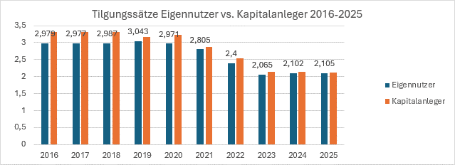 Ergänzend dazu ist die durchschnittliche Anfangstilgung seit 2019 von gut 3,0 Prozent auf rund 2,1 Prozent gesunken, um die monatliche Belastung unter den veränderten Zinsbedingungen tragfähig zu halten.