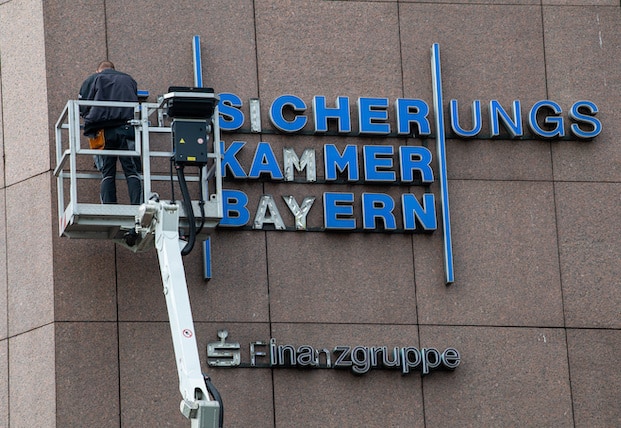 Die Statue „Walking Man“ steht vor der Zentrale der Munich Re – einige Erst- und Rückversicherer in Deutschland konnten im vergangenen Jahr große Schritte beim Umsatz machen, zugleich gab es mancherorts Einbußen zu verzeichnen. © picture alliance / Lino Mirgeler/dpa | Lino Mirgeler