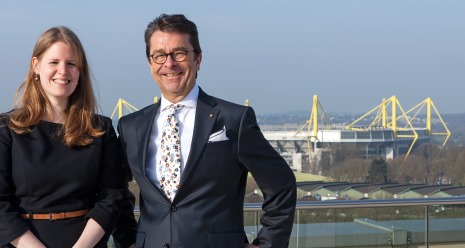 Michael Johnigk (im Foto mit Pfefferminzia-Chefredakteurin Karen Schmidt und dem Signal Iduna Park zu sehen, Foto: Rüdiger Glahs), 1953 in Paderborn geboren, studierte Betriebswirtschaftslehre an der Uni Köln. Er sammelte Erfahrungen als Außendienstmitarbeiter, bevor er Landesdirektor bei der Gothaer Versicherungsbank wurde und gleichzeitig Geschäftsführer der Berliner Bank Versicherungsservice. 1996 übernahm Johnigk die Vorstandsressorts Vertrieb und Marketing sowie Aus- und Weiterbildung der damaligen Iduna Nova Gruppe. Seit 1999 ist er als Mitglied des Vorstands der Signal Iduna Gruppe für Vertrieb, Marketing, Personalentwicklung und Unternehmensverbindungen verantwortlich.