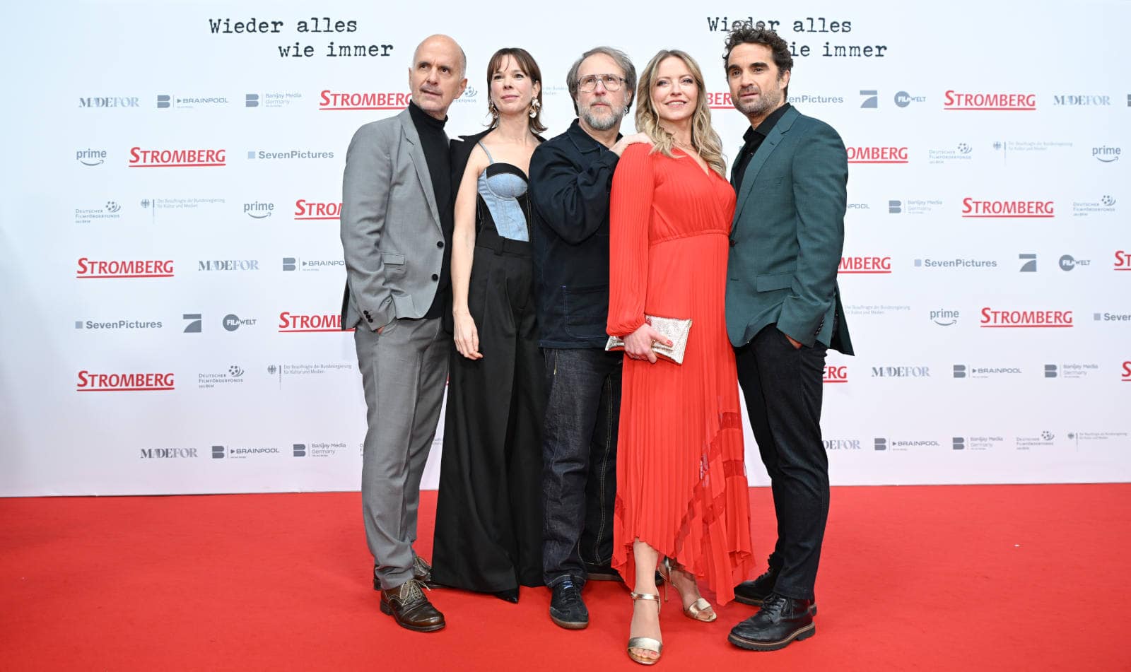 Stromberg-Darsteller auf der Weltpremiere am 1. Dezember 2025 im Zoo Palast Berlin (v.l.n.r.): Christoph Maria Herbst, Milena Dreißig, Bjarne Mädel, Diana Staehly, Oliver Wnuk (Foto: MadeFor Film / Oliver Walterscheid)