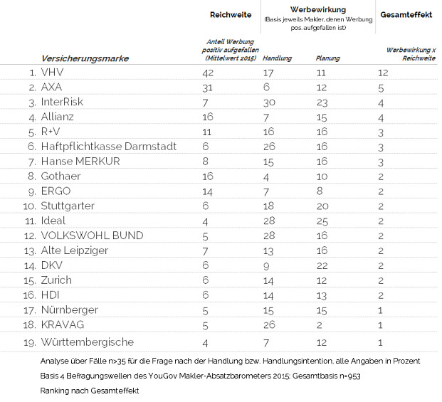 Durch Multiplikation der Reichweite mit der Wirkung kann der Gesamteffekt der Werbung im Maklervertrieb ermittelt werden. Danach gewinnt wiederum die VHV mit der höchsten Reichweite und einer durchschnittlichen Wirkung auf die Handlung beziehungsweise Handlungsintention von Maklern, gefolgt von Axa und Interrisk noch vor der Allianz und R+V.